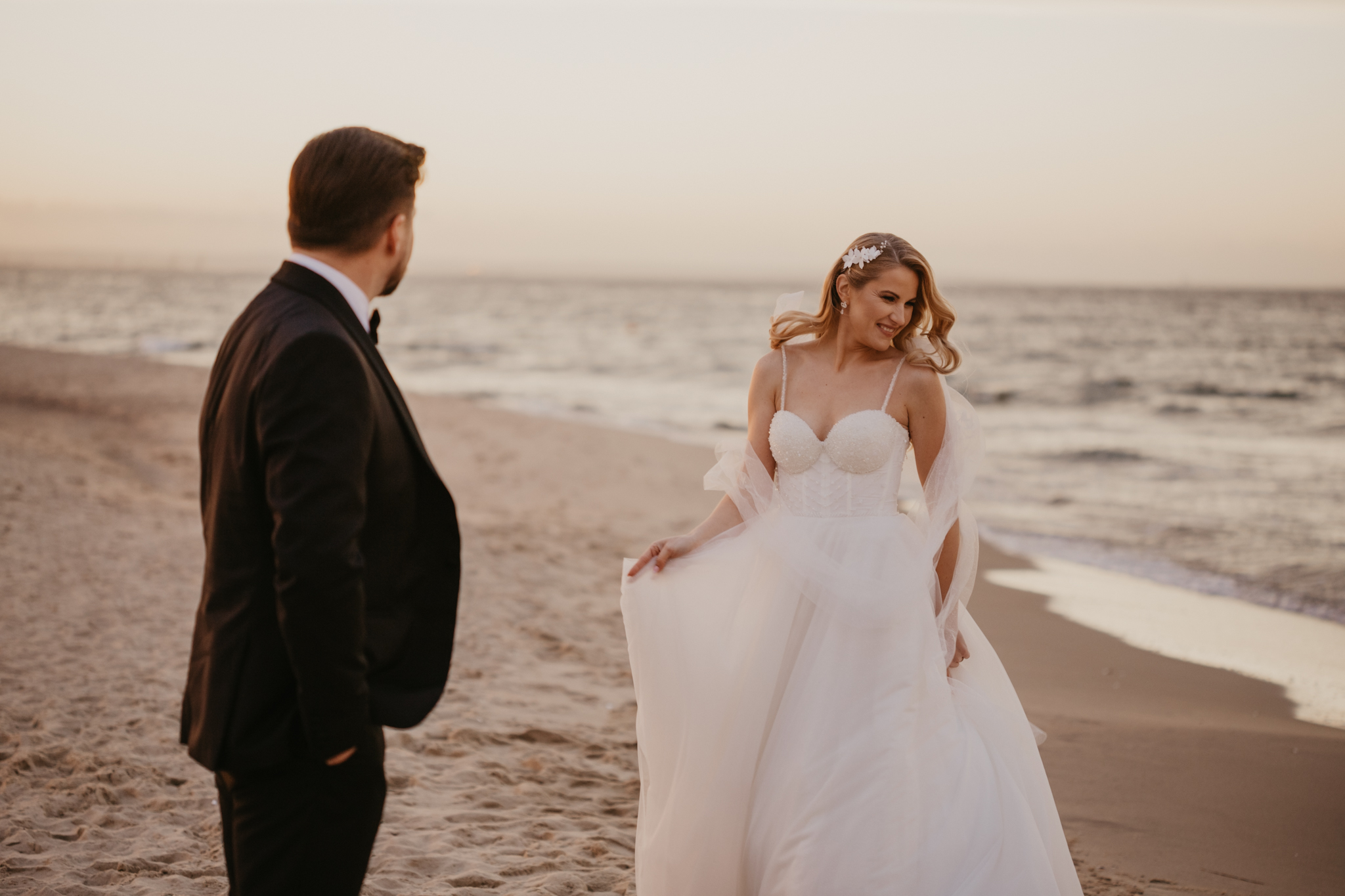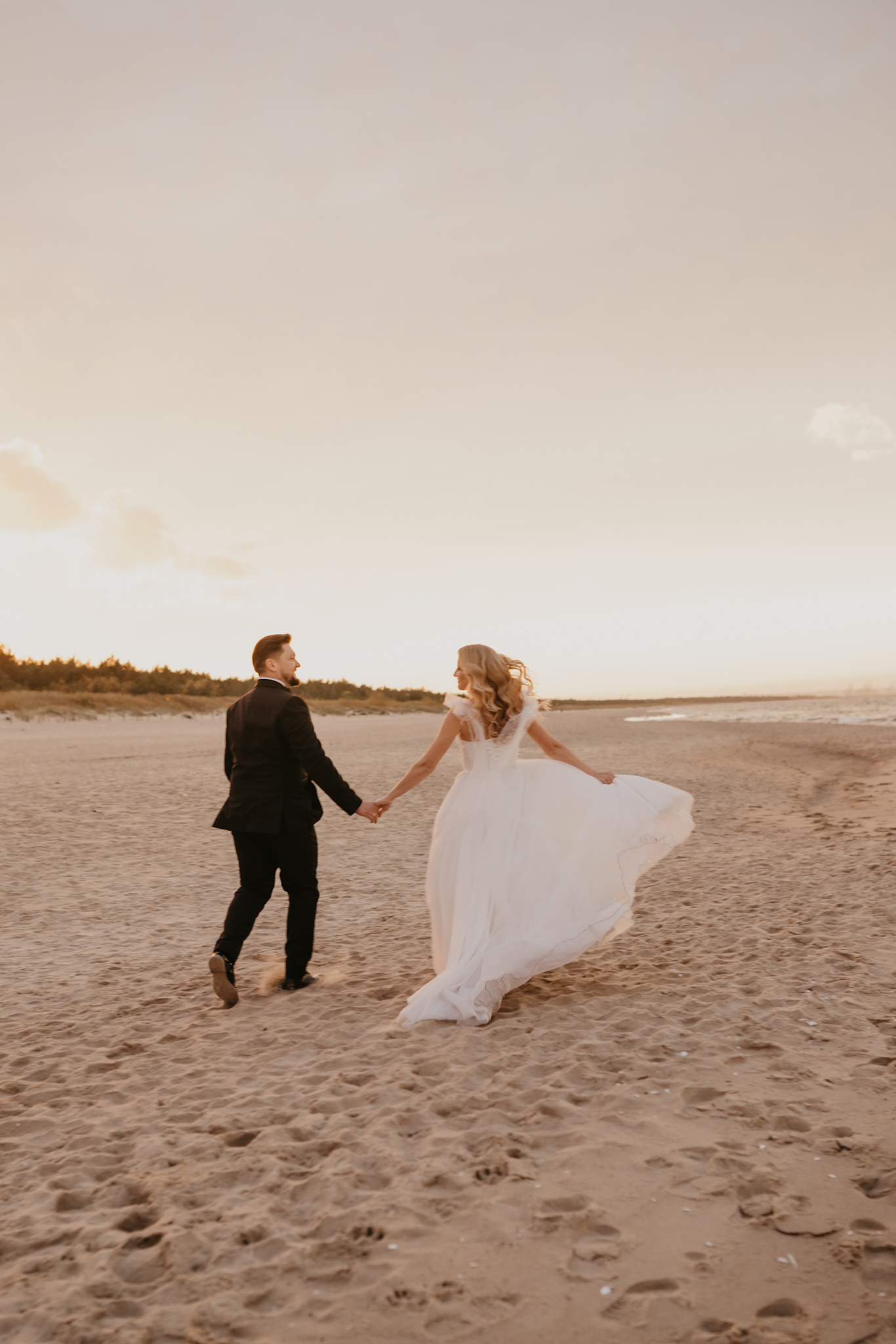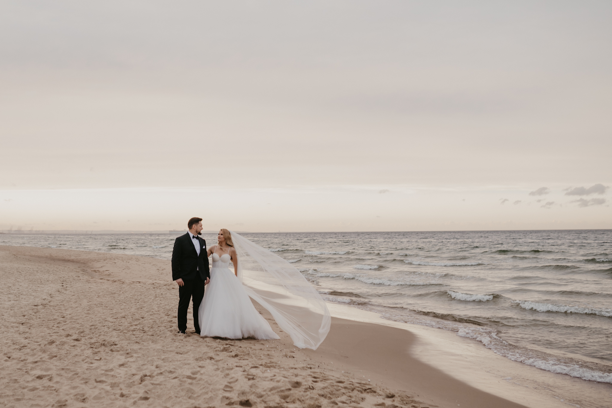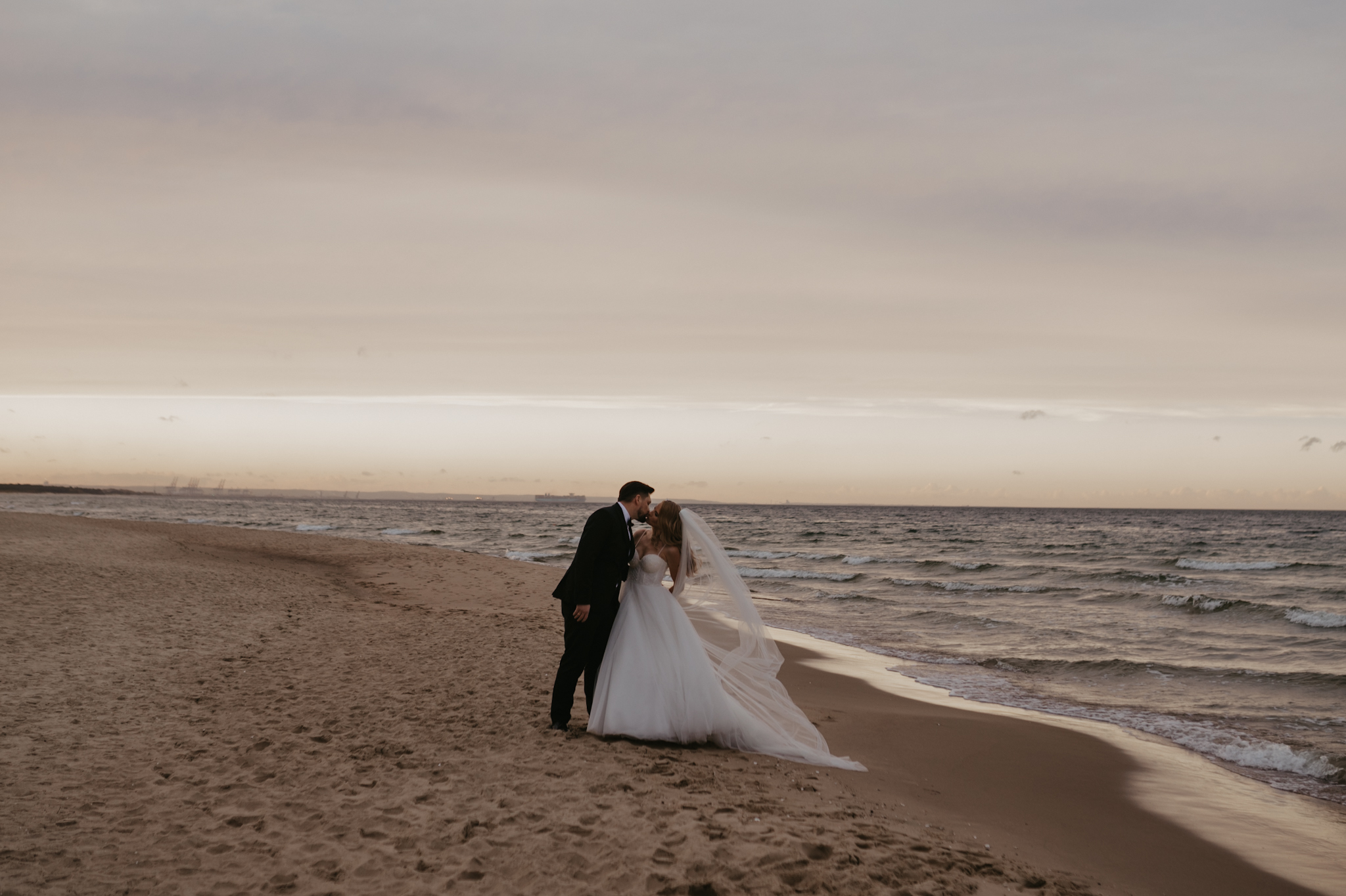 Zaczęłyśmy się stresować, ponieważ razem z Iloną i Marcinem umówiłyśmy się na sesję na plaży przy zachodzącym słońcu. Ilona wymalowana, wyczesana, a samolotu ni widu ni słychu… Skontaktowałyśmy się z parą i powiadomiłyśmy o tym małym problemie, a później pozostało nam tylko czekać. Na szczęście udało nam się dotrzeć do Gdańska na czas i mogliśmy zacząć sesję.