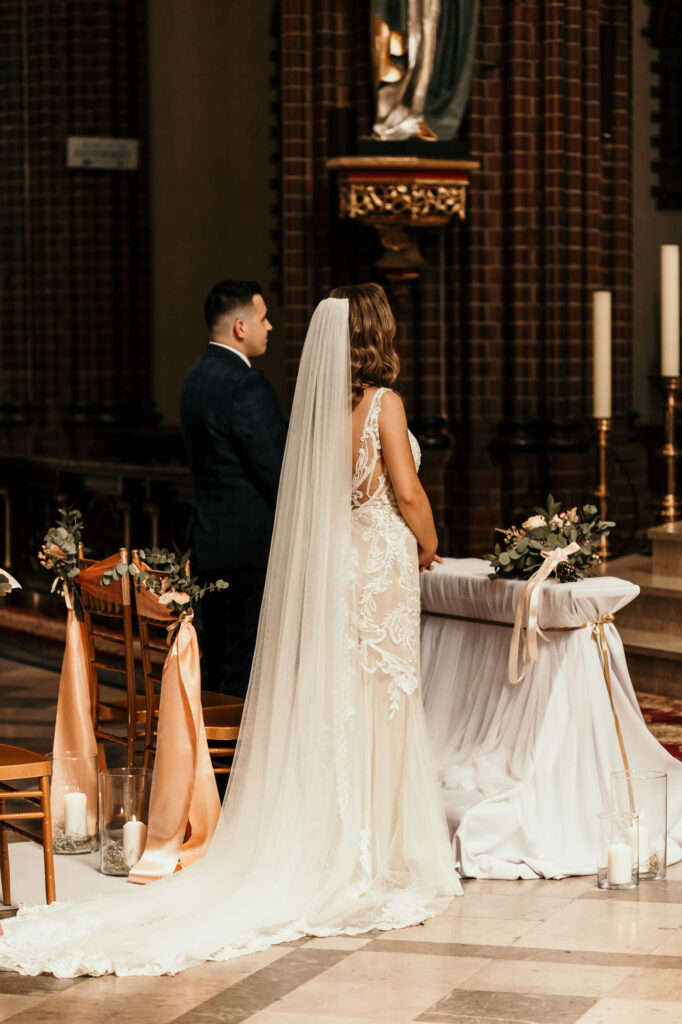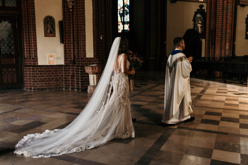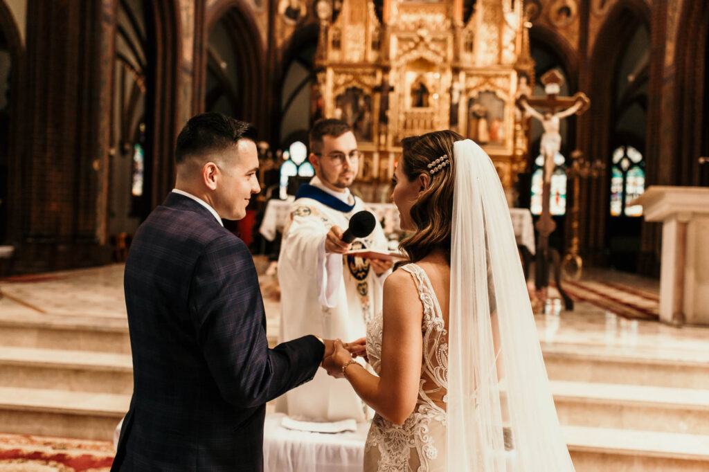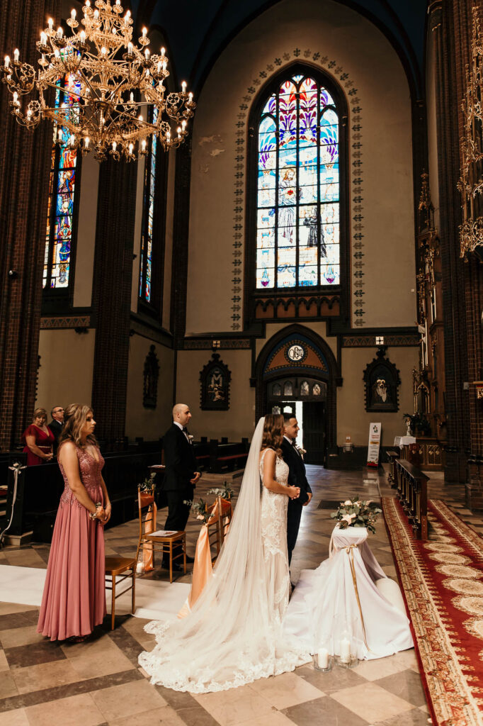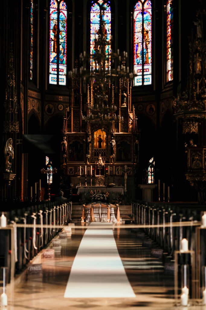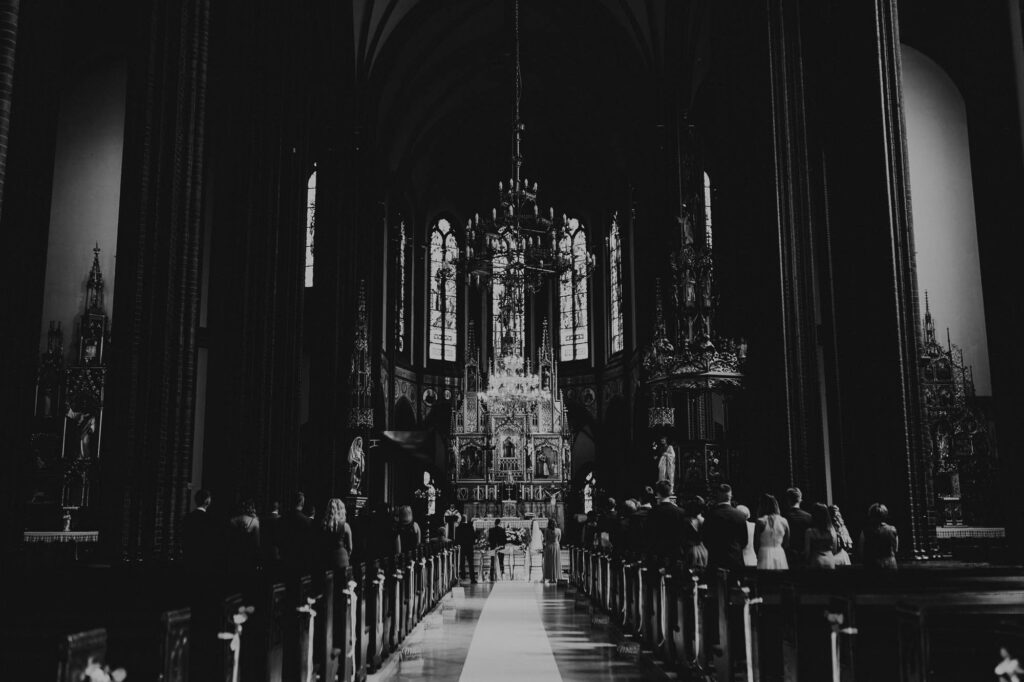 Podczas gdy ceremonia Kasi i Pawła rozpoczynała się w zabytkowych murach Rybnickiej Bazyliki, miłość i tradycja splatały się w jedno. (LSI Keyword: Romantyczne Miejsce na Ślub)